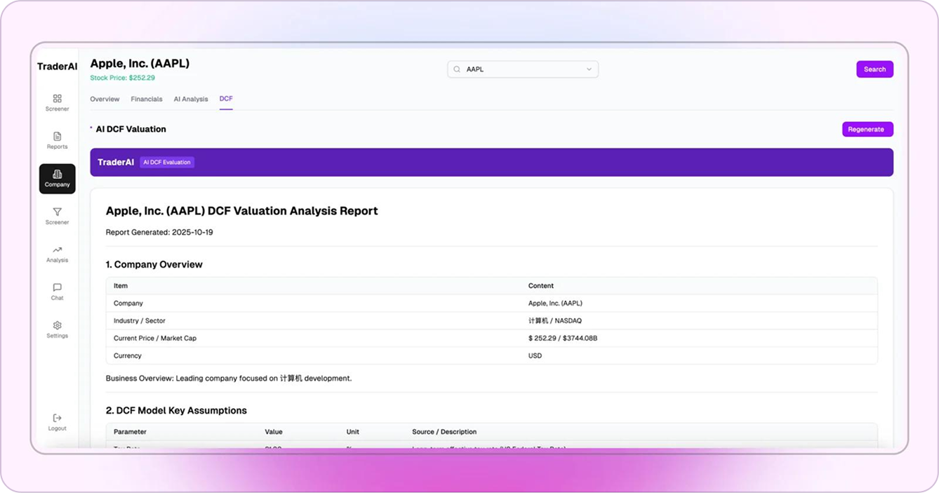 Built-in professional DCF valuation model automatically calculates company intrinsic value. Combining multiple valuation methods to provide comprehensive investment analysis reports, helping financial professionals make more accurate investment decisions.