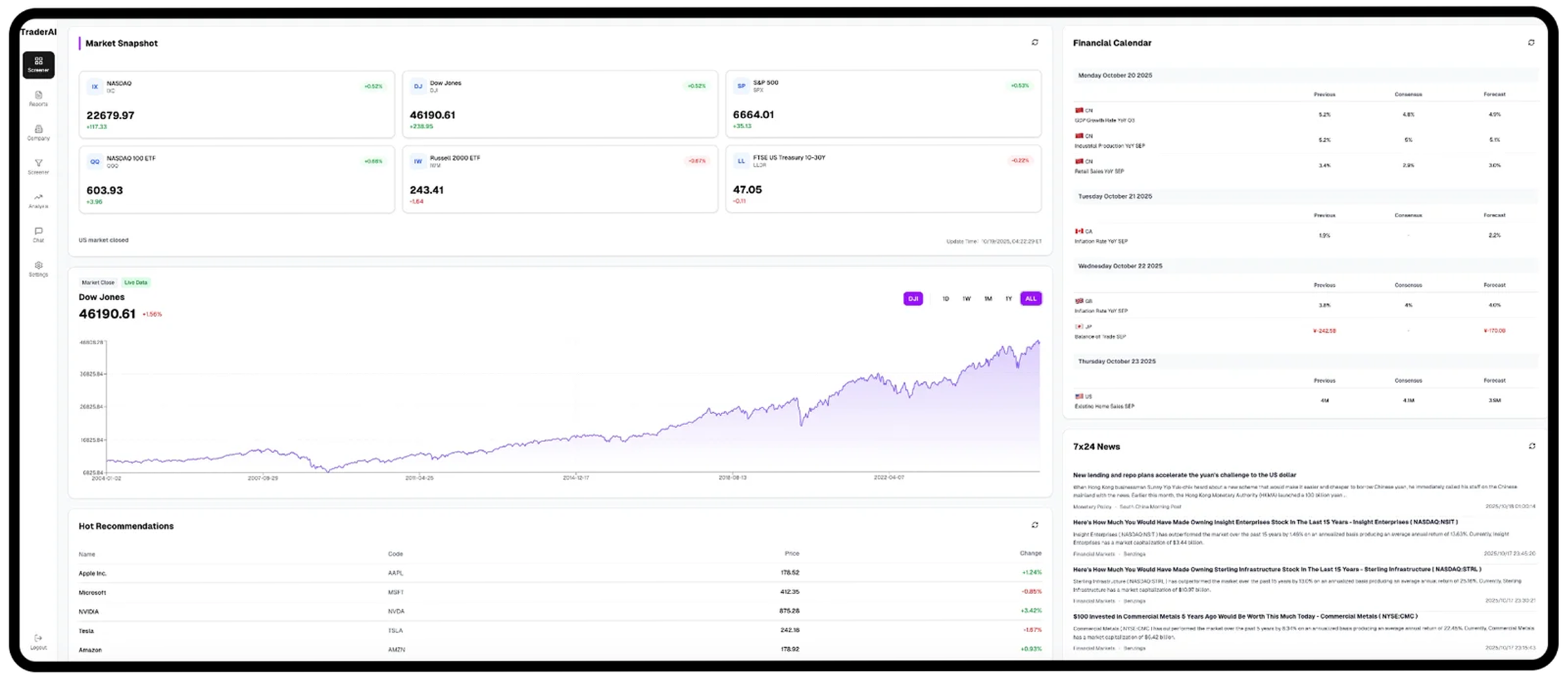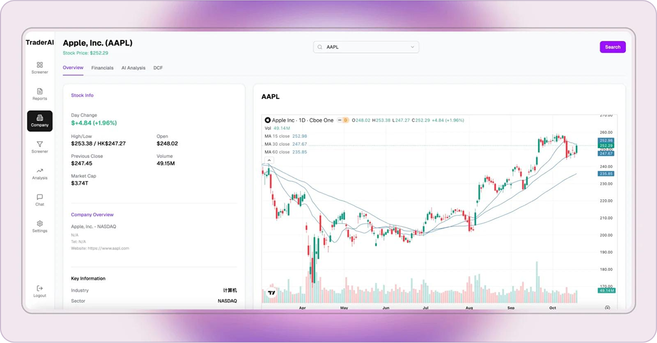 TraderAI delivers intelligent, professional, and accurate stock analysis powered by AI technology, offering real-time market insights, technical indicators, and risk assessments.